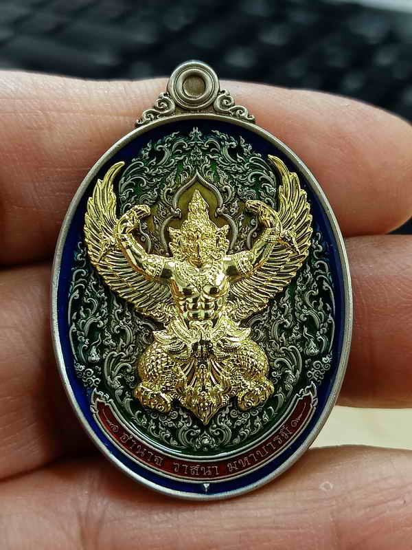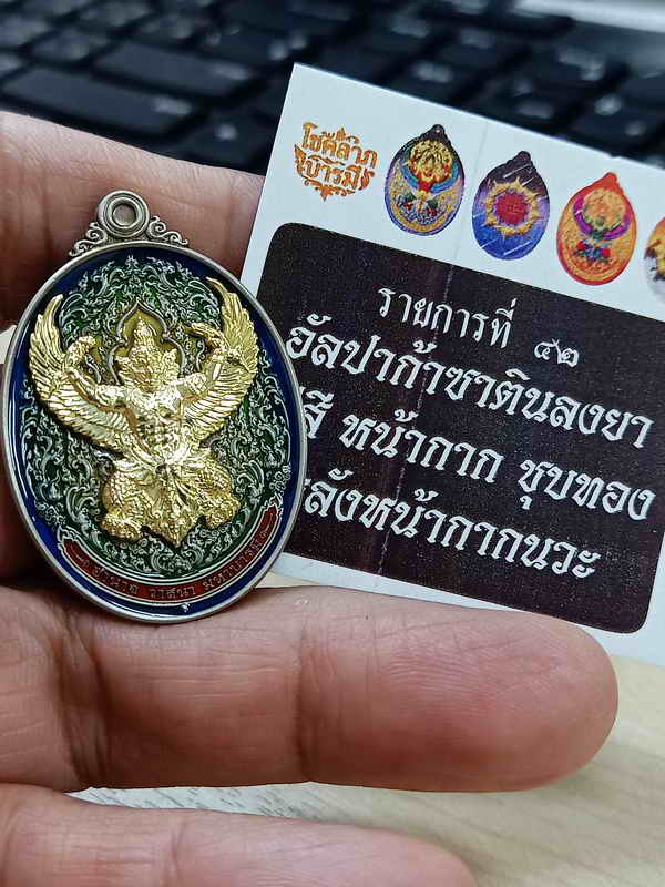 วัดใจ 100 เหรียญพญาครุฑปั้มพุทธศิลป์โชคลาภ บารมี พระอาจารย์เลี้ยง ธีรวโร วัดจอมเกษ บางปะหัน จ.พระนครศรีอยุธยา 2568 อัลปาก้าซาติน ลงยาไลาสี หลังหน้ากากนวะ หมายเลข 444 กล่องเดิม