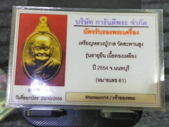 เหรียญหลวงปู่วาส วัดสะพานสูง รุ่นอายุยืน เนื้อทองเหลือง ปี 2554 จ นนทบุรี หมายเลข 61 มีบัตรรับรองพระแท้ พระมีรอบลั่นนะครับ