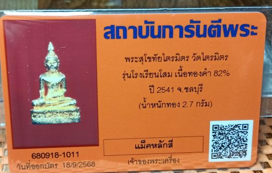 ชื่อพระเครื่อง พระเนื้อทองคำ พระสุโขทัยไตรมิตร วัดไตรมิตร หนัก 2.7กรัม จ.ชลบุรี บัตร gpa+++++++++++++++