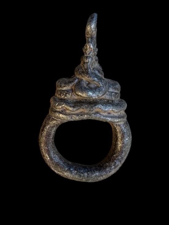 เครื่องรางโลหะเก่า ทรงแหวนมีปลายยอด หล่อโบราณทั้งองค์ ผิวแห้งเดิม สภาพจัดตามรูป