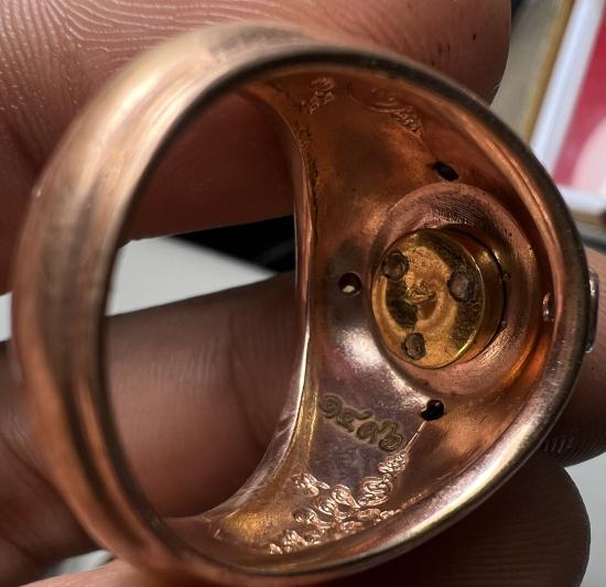 พรหมประสิทธิ์ แหวนมหาจักร มวลสารร้อยล้าน เนื้อสัตตะชุบพิงค์โกล์ จักรมวลสาร ฝังอัญมณี ทับทิม,ไพลิน,บุษราคัม,มรกต ของเสี่ย อั๋น โอกิ จักรหมุนได้ มวลสารร้อยล้านบาท หมายเลขสวย ๑๔๙๖ เส้นผ่าศูนย์กลางวงในขนา