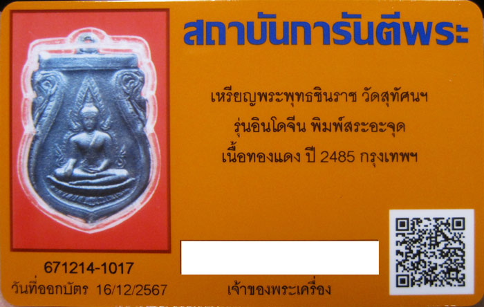 เหรียญพระพุทธชินราช วัดสุทัศนฯ รุ่นอินโดจีน พิมพ์สระอะจุด (นิยม) สภาพสวย รมดำผิวปรอทหน้า-หลัง พร้อมบัตรรับรอง