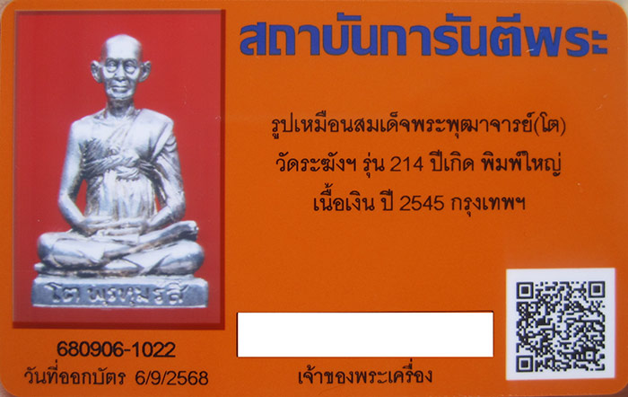 รูปหล่อสมเด็จโต วัดระฆัง รุ่น214ปีเกิด พิมพ์ใหญ่ เนื้อเงิน มีครอบแก้วเดิม พร้อมบัตรรับรอง