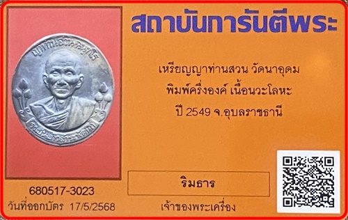 เหรียญญาท่านสวน วัดนาอุดม พิมพ์ครึ่งองค์ เนื้อนวะโลหะ ปี2549 มีบัตรรับรองจีพระ เคาะเดียว