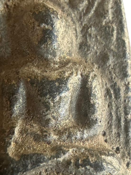 เก็บจากบ้านเดิม ฟอร์มตรงยุค เนื้อแห้งจัด ผิวละเอียดตามธรรมชาติของพระดินเก่า ด้านหลังมีคราบทองเก่าติดชัด เป็นสัญญาณว่ามีการลงทองหรือมีการบูชามานาน มวลสารแน่น มีเม็ดกรวด ผิวแกร่ง ใช้ขึ้นคอเสริมเมตตา ค้าขาย โชคลาภดีมาก องค์นี้เนื้อจัดสวยสุดในราคาเข้าถึงง่าย (เคาะเดียวแดง)