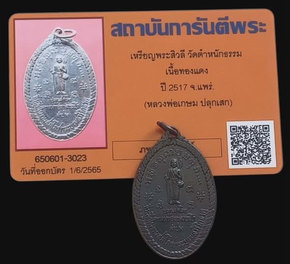 คัดมาสวยๆมีบัตรรับรองจากการันตรีพระครับ จัดส่งพร้อมบัตรการันตรีพระ เหรียญพระสิวลี เนื้อทองแดง ออกที่วัดตำหนักธรรม ต.แม่คำมี อำเภอร้องกว่าง จังหวัดแพร่ ปี2517 พิธีสมโภชพระบรมสารีริกธาตุ ปลุกเสกโดยหลวงพ่อเกษม เขมโก สร้างน้อยหายาก น่าเก็บน่าใช้ เพราะเด่นทางมหาลาภของพระสิวลีเถระผู้เป็นเลิศทางโชคลาภสักการะ แม้แต่ครั้งหนึ่งพระพุทธเจ้าเองยัง ได้รับอานิสงค์ความเป็นผู้มีโชคของพระสิวลี เมื่อครั้งติดฝนแล้วไม่สามารถบิณบาตรได้ ก็ยังมีชาวบ้านหาของป่าพลัดหลงเข้ามาแล้วถวายน้ำผึ้งและเนยข้นให้กับพระพุทธเจ้าและพระสิวลีเถระ เรียกว่าไม่มีอดเลยถึงอยู่ในที่กันดารห่างไกล และโดยเฉพาะหลวงพ่อเกษม เขมโก ท่านก็ขึ้นชื่อด้านบุญฤทธิ์ด้านอำนวยโชคเช่นกัน ดูตามร้านค้ามักมีรูปท่านบูชาเสมอ วัตถุมงคลของท่านเด่นเรื่องเมตตาโชคลาภสูง เป็นที่ยอมรับกันอยู่แล้ว ซึ่งถือได้ว่าเป็นเหรียญในยุคยอดนิยมของหลวงพ่อเกษม คือในยุคก่อนปี 2518