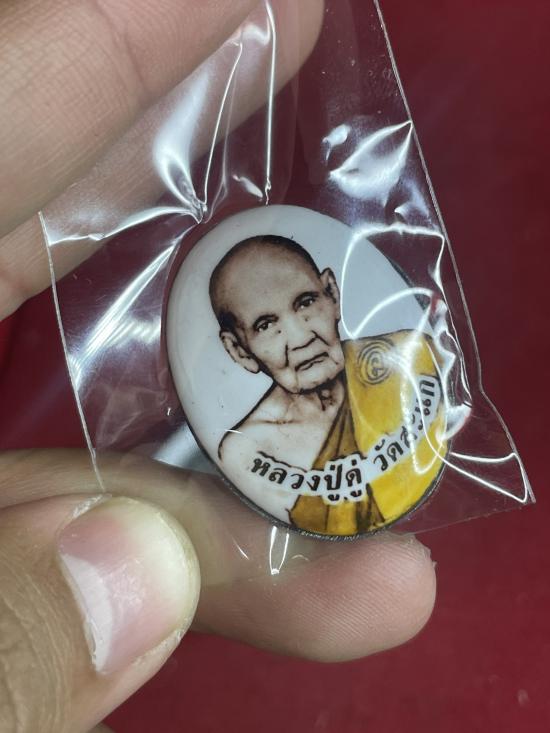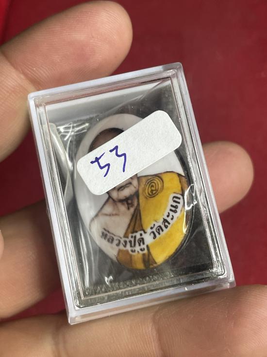 หลวงปู่ดู่ วัดสะแก ฉากขาว จีวรส้ม ซีเปีย พิมพ์รูปไข่ หลังยันต์ เนื้อตะกั่ว ปี 53 |