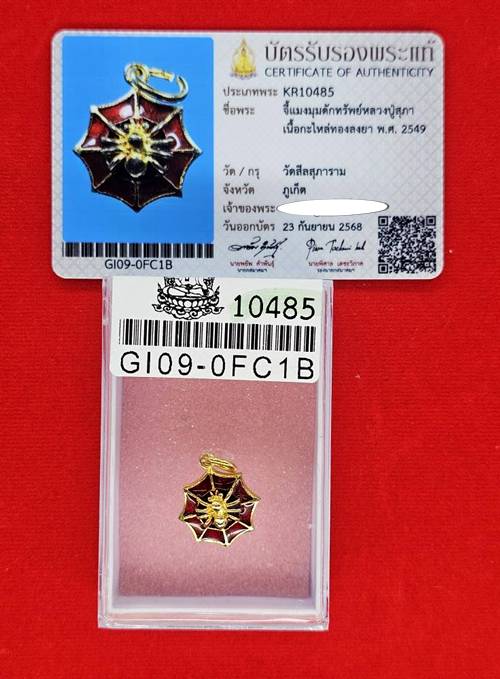 จี้แมงมุมดักทรัพย์ หลวงปู่สุภา วัดสีลสุภาราม เนื้อกะไหล่ทองลงยาแดง ปี2549 พร้อมบัตรรับรองสมาคมพระเครื่องพระบูชาไทย