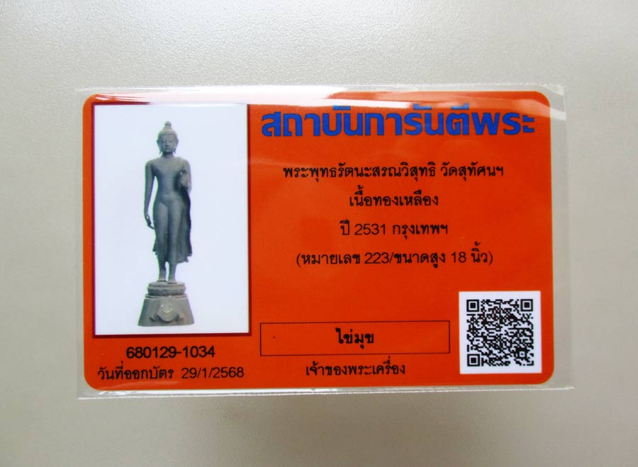 พระพุทธรัตนะสรณวิสุทธิ วัดสุทัศนเทพวราราม พ.ศ.2531 สูงรวมฐาน 18.5 นิ้ว เนื้อโลหะรมดำมันปู ผิวแห้งหิ้ง พร้อมบัตรรับรอง การันตีพระ !!