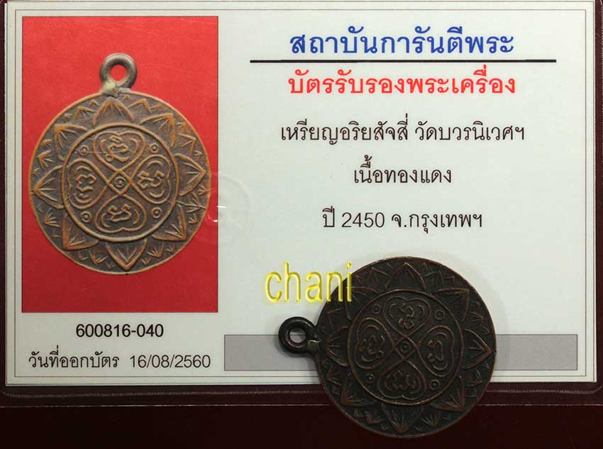 เหรียญ อริยสัจสี่ วัดบวรนิเวศฯ พิมพ์หลังธรรมจักร เนื้ิอทองแดง ปี2450 จ.กรุงเทพฯ สภาพสวยเดิมๆมาก หายาก พร้อมบัตรรับรองพระแท้จากจีพระอุ่นใจได้ ไม่ต้องลุ้นค่ะ |