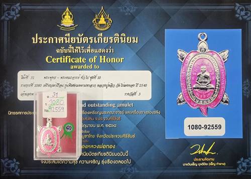 เหรียญเต่าเรือน หลวงปู่หลิว วัดไร่แตงทอง รุ่นพิเศษ เมตตามหาลาภ ปี2540 ติดรางวัลที่3