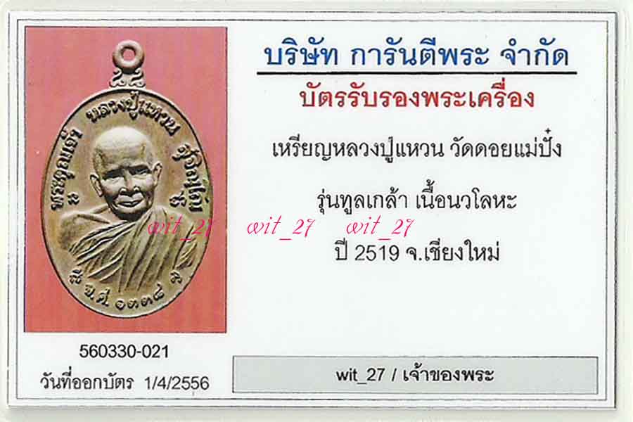 เหรียญทรัพย์สินหลวงแู่แหวน สุจิณโณ-รุ่นทูลเกล้า-เนื้อนวโลหะ-ปี 2519-วัดดอยแม่ปั๋ง เชียงใหม่..พร้อมบัตรรับรอง G-Pra... |