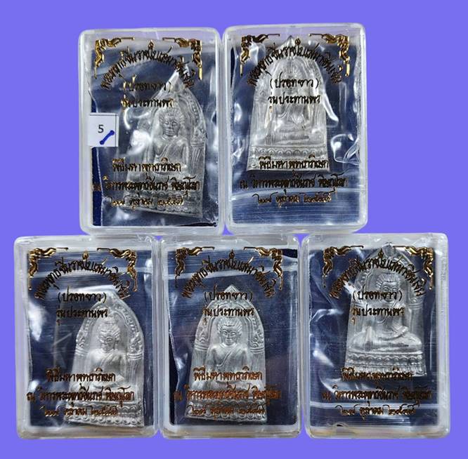 ( 5 องค์ ) พระพุทธชินราชใบเสมา รุ่นประทานพร เนื้อชินเงิน หรือเนื้อปรอทขาว จัดสร้างขึ้นในปี 2547 มาพร้อมกล่องเดิมจากวัดครับ 5