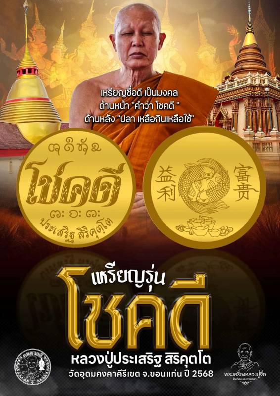 วัดใจ..เหรียญโชคดี หลวงปู่ประเสริฐ วัดอุดมคงคาคีรีเขต ขอนแก่น ปี 2568 เนื้อทองไหล ลงยาเขียว วันพุธ เลข 25