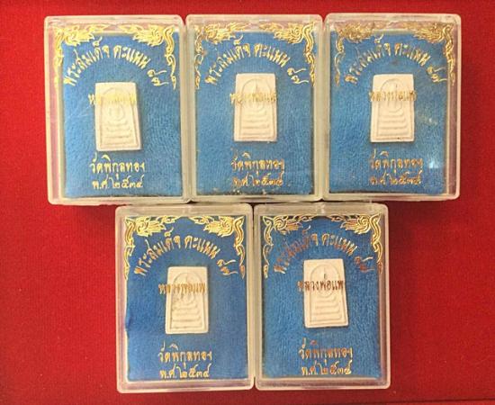 สมเด็จคะแนน 87 หลวงพ่อแพ วัดพิกุลทอง สิงห์บุรี สร้างปี 2534 ใช้เนื้อผงเกสรที่สร้างแพ 4 พันและปลุกเสกพร้อมแพ 4 พัน ฝังตะกรุดทองคำทุกองค์ กล่องเดิม พร้อมกัน 5 องค์ <318> |