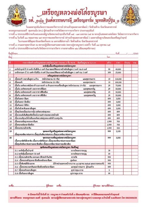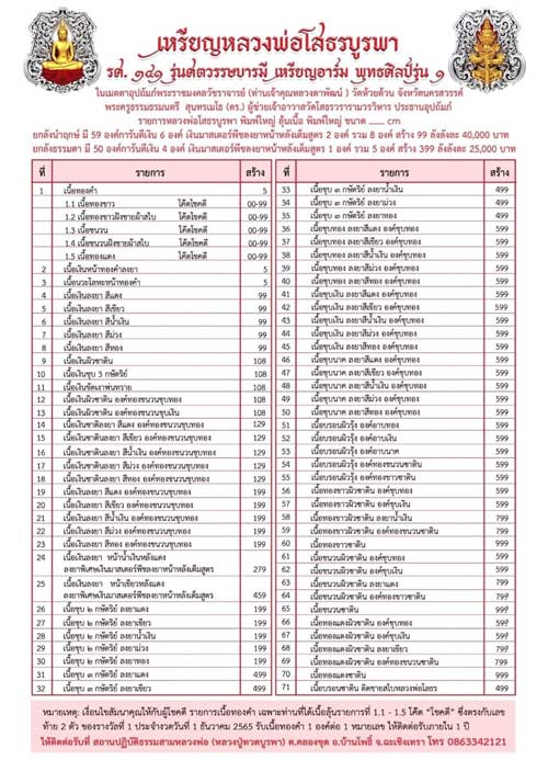 พิมพ์ใหญ่ ขนาด 3.2 ซม. รายการลุ้นเนื้อยกลังนำฤกษ์ มี 59 องค์ (การันตีเนื้อเงิน 6 องค์ เงินมาสเตอร์พีสลงยาหน้าหลังเต็มสูตร 2 องค์ รววม 8 องค์ สร้าง 99 ลัง) พระยังไม่ได้แกะซีล ลุ้นหมายเลขสวยๆกันครับ