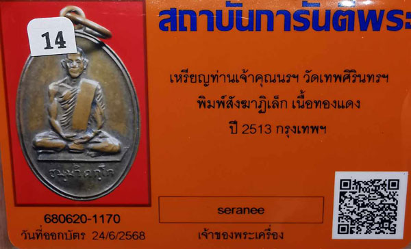 เหรียญท่านเจ้าคุณนรฯ วัดเทพศิรินทรฯ พิมพ์สังฆาฏิเล็ก หูขีด เนื้อทองแดง ห่วงเดิม ปี2513 จ.กรุงเทพฯ + บัตรG-pra สภาพเดิมค่ะ สภาพตามรูปทุกประการค่ะ