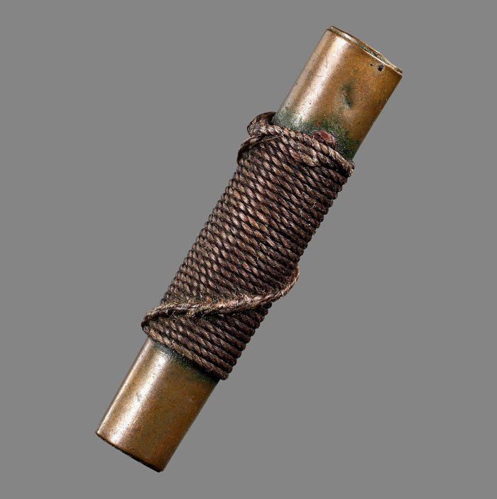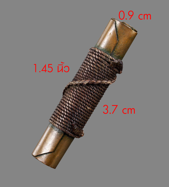 ตะกรุดสาริกา (ไม่ทราบที่) เนื้อทองแดง ถักเชือกเก่ามีอายุ ขนาดตะกรุดยาว 1.45 นิ้ว |