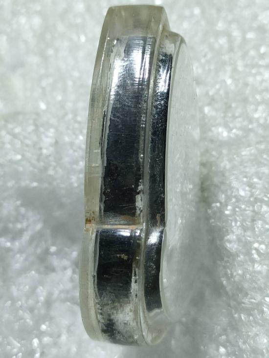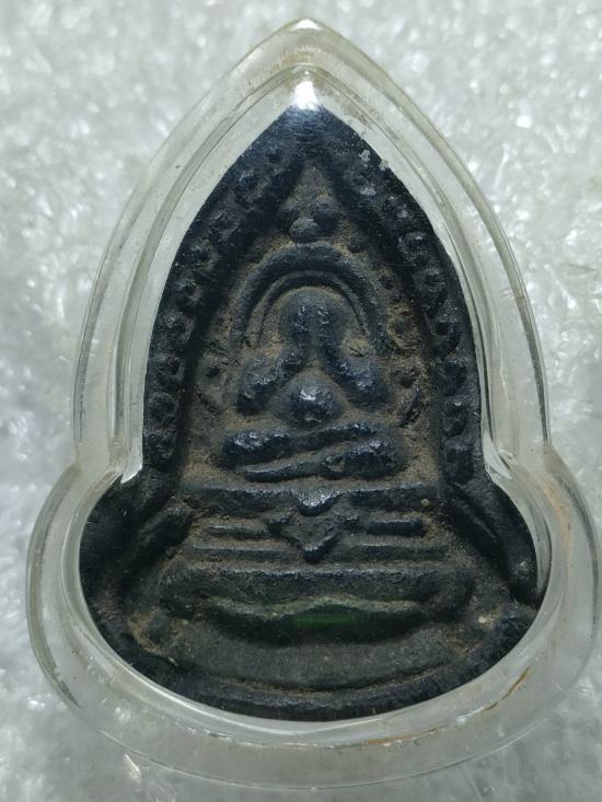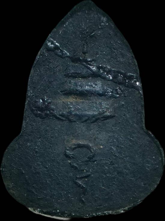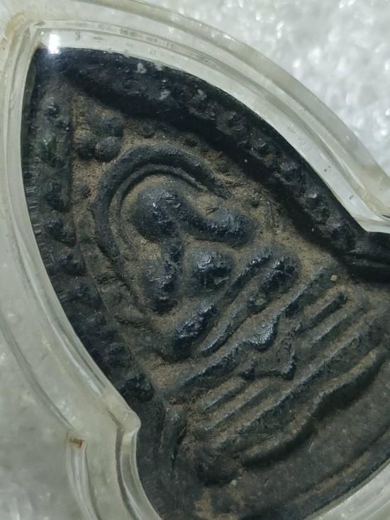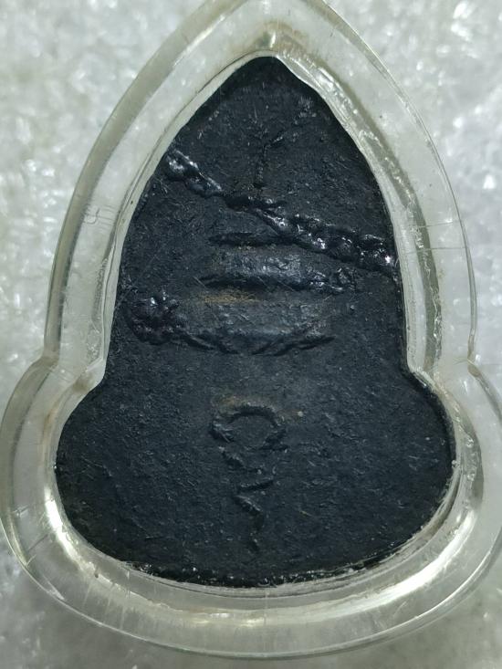 พระปิดตาหลังฉัตรเล็ก หลวงปู่เฮี้ยง วัดป่า ปี2505 เนื้อผงคลุกรัก ด้านหน้าด้านหลังมีเส้นเกศา
