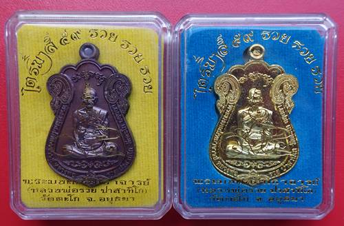 เหรียญไตรมาส 59 รวย รวย รวย เนื้อทองแดง+ทองทิพย์ หลวงพ่อรวย วัดตะโก อยุธยา
