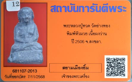 พระหลวงปู่ทวด วัดอ่างทอง พิมพ์หัวมวย เนื้อผงว่าน ปี2506 พร้อมบัตร เคาะเดียว