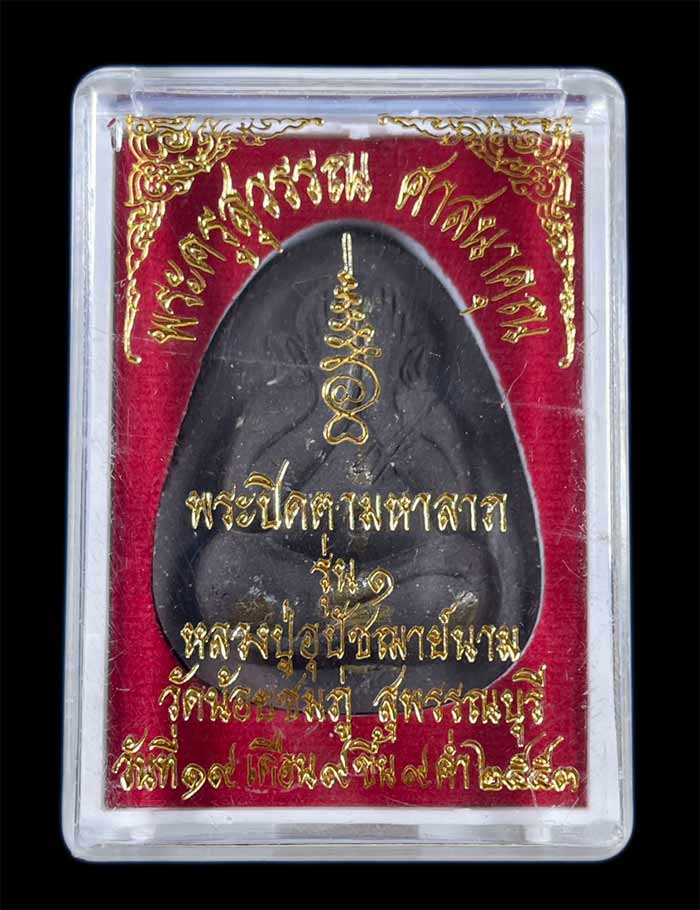 พระปิดตาจัมโบ้มหาลาภรุ่น1 หลังจีวร หลวงปู่นาม วัดน้อยชมภู่ จ.สุพรรณบุ รี ปี2553 เนื้อน้ำตาล พร้อมจารหมึกทอง กล่องเดิม