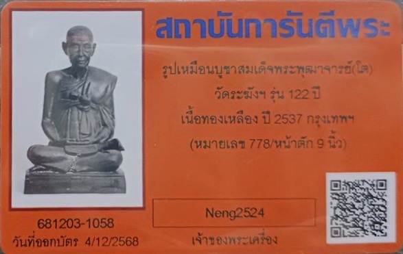 รายละเอียด พระบูชาสมเด็จพุฒาจารย์ (โต) วัดระฆัง อนุสรณ์ 122 ปี พ.ศ.2537 หน้าตัก 9นิ้ว บัตรG-PRA หมายเลข 778