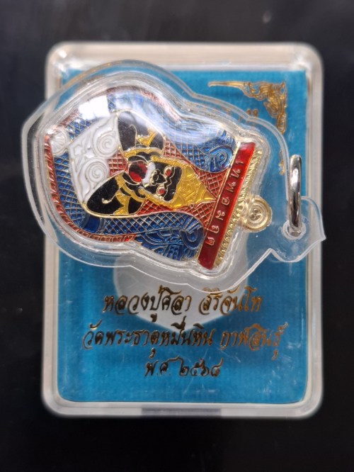 เหรียญพระราหูอมจันทร์ หลวงปู่ศิลา เมตตาอธิษฐานจิต รุ่นเหนือดวง เนื้อทองเหลืองลงยา เลี่ยมกรอบ |