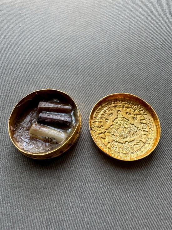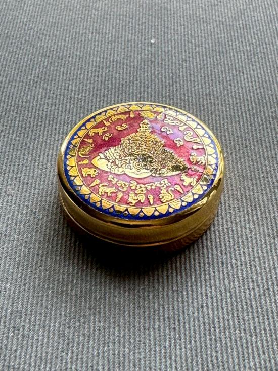 เคาะเดียวไวไว ตลับสีผึ้งพระราหู มหานิยมอุดมโชค จตุคามรามเทพ รุ่น มงคลจักรวาล ปี2549 พิมพ์เล็ก ขนาด3.2ซม ลงยาแดง ลงเบญจรงค์น้ำทอง สีผึ้งด้านในเดิมๆ |