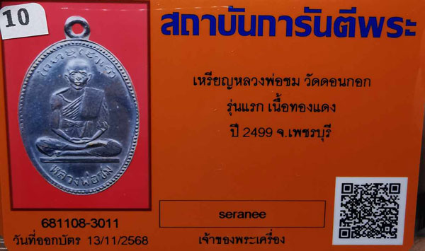 เหรียญหลวงพ่อชม วัดดอนกอก รุ่นแรก เนื้อทองแดง ปี2499 จ.เพชรบุรี + บัตรG-pra สภาพเดิมค่ะ |