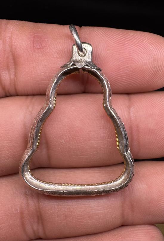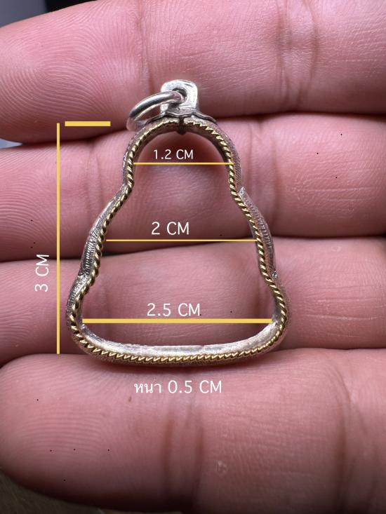 - กรอบผ่าหวาย เงินแท้ แกะลาย หนัก 4.25 g. ด้านหน้าตีเกลียวเชือก ทองคำแท้ (น้ำหนักทองตอนสั่งทำช่างบอกว่า หนักเกือบๆ 1 กรัม ) ใส่พระปิดตา รวยไม่ยั้ง หรือพระปิดตาลอยองค์เกจิ อื่นๆ มีใบยิง % ทั้งเงินและทองครับ