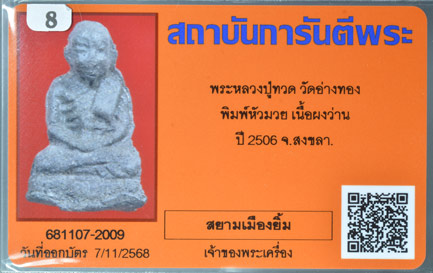ชื่อพระเครื่อง พระหลวงปู่ทวด วัดอ่างทอง พิมพ์หัวมวย เนื้อผงว่าน ปี2506