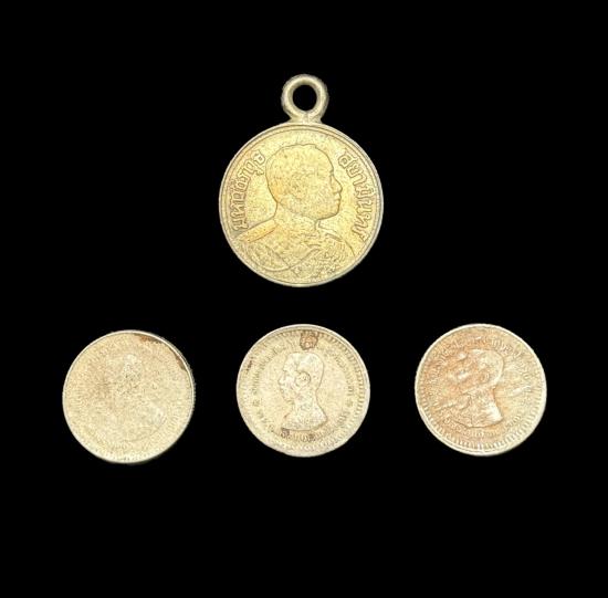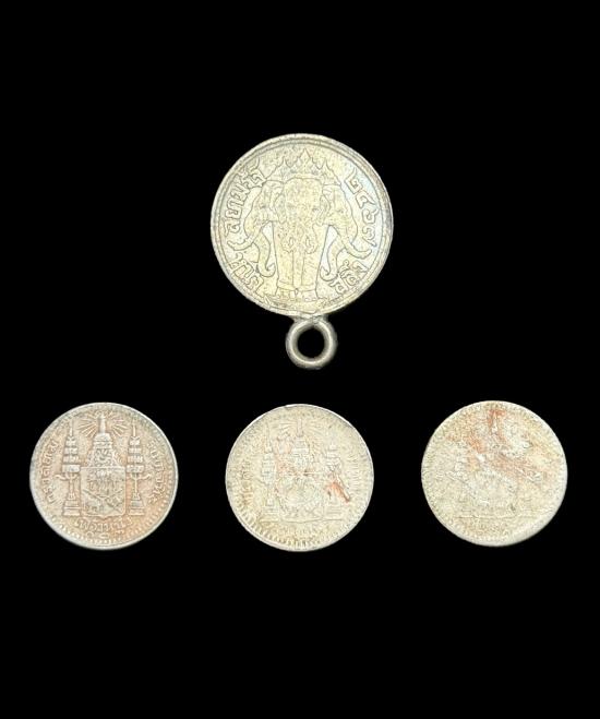 เคาะเดียวแดง 4 เหรียญ เหรียญบาทหนึ่ง ร.5 หลังตราแผ่นดิน พิมพ์เล็ก 3องค์ และ เหรียญหนึ่งบาท เหรียญหนวด รัชกาลที่6 หลังช้างสามเศียร เนื้อเงิน