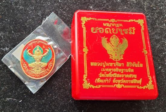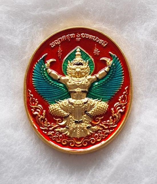 เหรียญพญาครุฑ หลวงปู่ศิลา วัดโพธิ์ศรีสะอาด รุ่นยอดบารมี ลังนำฤกษ์ เนื้ออาบทองโบราณ ลงยาทรงเครื่อง ลงยาปีกครุฑ พื้นแดง No.18 |
