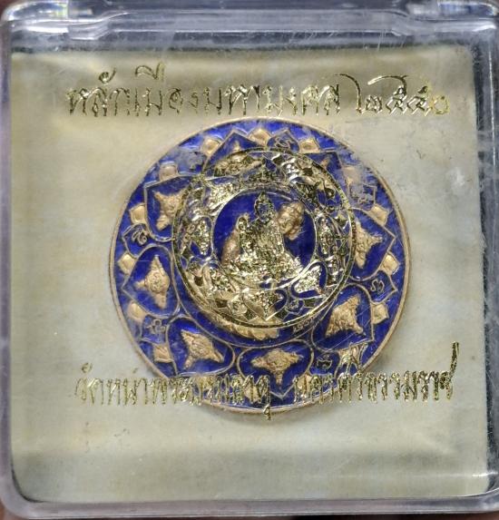 เหรียญจตุคาม รามเทพ เนื้อทองแดงกะไหล่ทองลงยาน้ำเงิน รุ่นหลักเมืองมหามงคล 50 ขนาด 3.2 ซม. พร้อมกล่องเดิม |