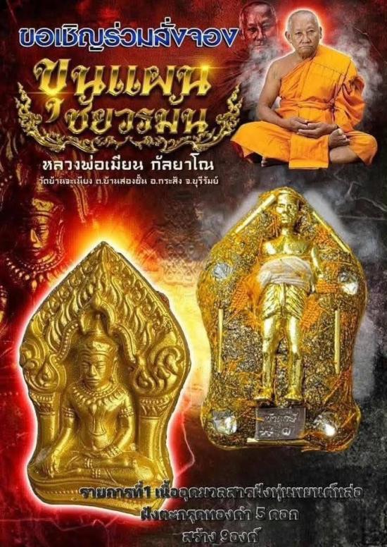 พระขุนแผนชัยวรมันหลังหุ่นพยนต์ หลวงพ่อเมียน วัดจะเนียง บุรีรัมย์ หลวงปู่มหาศิลา (หลวงปู่ศิลา)อธิษฐานจิต เนื้อก้นครกฝังตะกรุดทองคำแท้ๆ 2 ดอก(แถมยกลัง) จำนวนสร้างน้อยเพียง 10 องค์เท่านั้น มวลสารเข้มขลัง สวย หายาก ปัจจุบันวัตถุมงคล หลวงพ่อเมียนขยับราคาขึ้นทุกรุ่น พุทธคุณประสบการณ์ของพระเครื่องของท่านยิ่งมากและไม่ธรรมดา จนถึงประสบการณ์ที่ผู้บูชานับถือได้ประสบพบมากับตัวเองแล้วนั้นด้วย วัตถุมงคลหลวงพ่อเมียนประสบการณ์มากมาย ห้ามพลาดด้วยประการทั้งปวงแล้วครับ รับประกันชั้นหนึ่งครับ