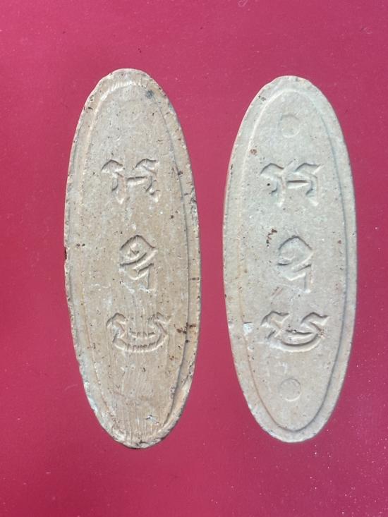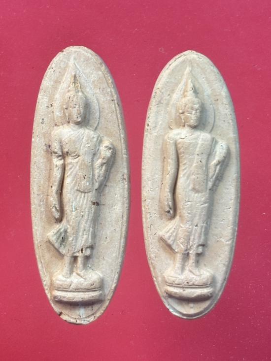 พระลีลา 25 พุทธศตวรรษ ปี 2500 เนื้อดิน สีเหลืองนวล 2 องค์ เคาะเดียว |