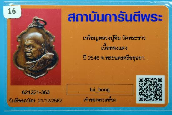 เหรียญหลวงปู่ทิม วัดพระขาว เนื้อทองแดง ปี 2546 จ.พระนครศรีอยุธยา + บัตร G |