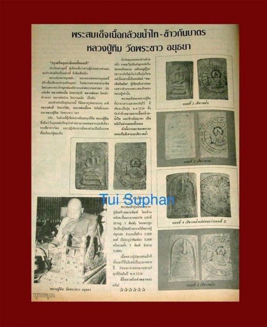 สมเด็จเนื้อกล้วยน้ำไท - ข้าวก้นบาตร หลวงปู่ทิม วัดพระขาว สวย พร้อมใบประกาศนียบัตร เป็นพระสมเด็จ หลวงปู่ทิม ที่น่าเสาะแสวงหาเก็บกันไว้ พระสมเด็จ เนื้อกล้วยน้ำไท-ข้าวกันบาตร ปี 2524 เนื่องจากเนื้อของพระรุ่นนี้ มวลสารหลักเป็นกล้วยน้ำไทและข้าวกันบาตร ดังนั้นวรรณะของ พระจะออกเป็นสีเทาและสีขาวคล้ำ โดยพระรุ่นนี้จัดสร้างกันหลายพิมพ์ ด้านหลังปั้มตรายางของวัด พระลูกวัดเป็นผู้สร้างถวายให้หลวงปู่ทิมปลุกเสก เท่าที่ปรากฏมี 5 พิมพ์ เมื่อหลวงปู่ปลุกเสกแล้ว ก็เก็บเอาไว้ในโบสถ์เป็นเวลาหลายปี ก่อนจะนำออกมาแจกแก่ญาติโยมในปี 2524 ถ้าเป็นผู้ที่ศรัทธาหลวงปู่ทิม รุ่นนี้น่าเก็บไว้ในคอลเล็กชั่นที่สุดรุ่นนึง หลักฐานอ้างอิงจาก หนังสือพุทธคุณ