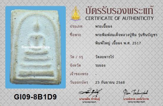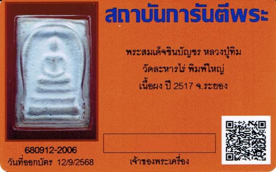 พระสมเด็จชินบัญชร หลวงปู่ทิม พิมพ์ใหญ่ ปี2517+บัตรรับรอง2สถาบัน