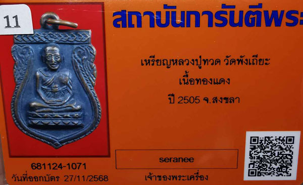 เหรียญหลวงปู่ทวด วัดพังเถียะ เนื้อทองแดง ห่วงเดิม ปี2505 จ.สงขลา + บัตรG-pra สภาพเดิมค่ะ |