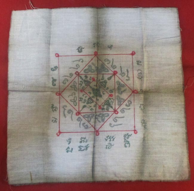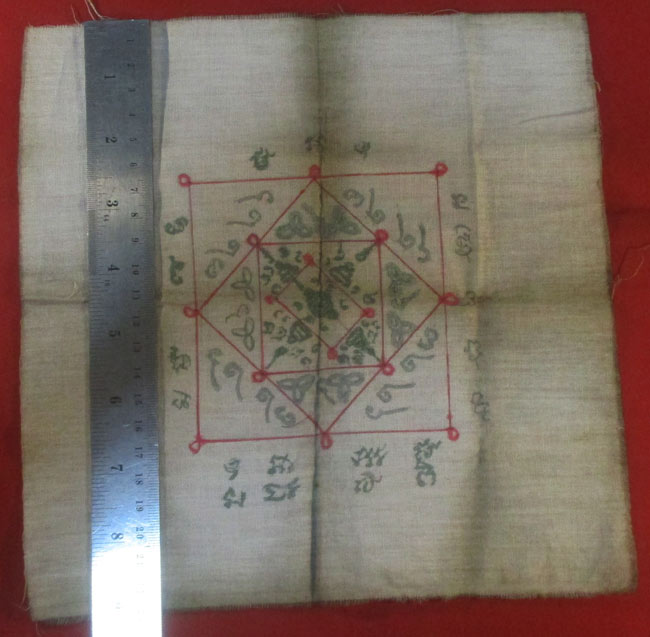ผ้ายันต์ ไม่ทราบที่ จารยันต์ด้วยมือ เนื้อผ้าดูเก่า ครับ