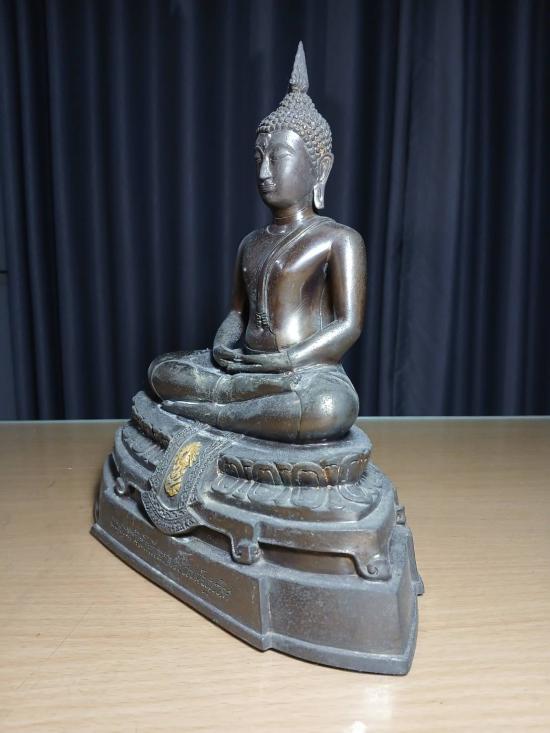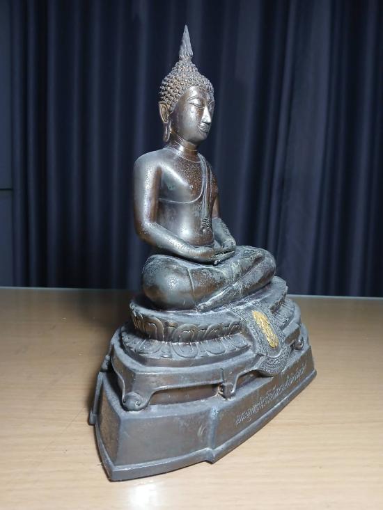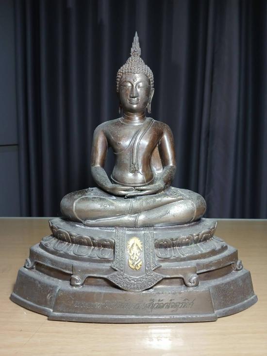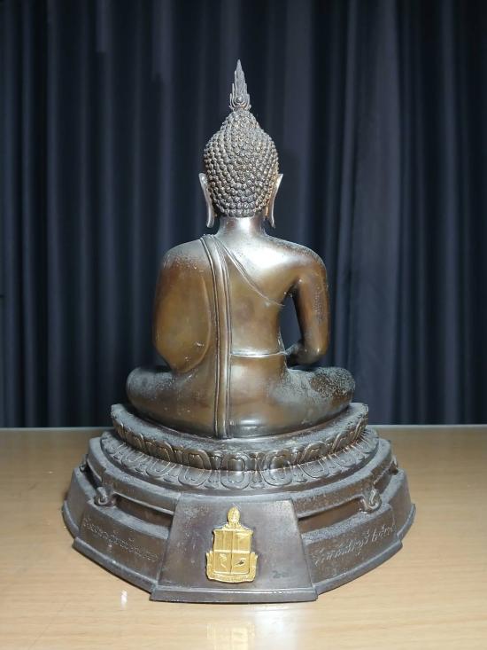 พระพุทธนิรโรคันตรายชัยวัฒน์จตุรทิศ วัดมงคลชัยพัฒนา จ.สระบุรี มูลนิธิชัยพัฒนา พ.ศ.2539 หน้าตัก 6 นิ้ว ฐานมีตราภปร. เนื้อโลหะรมมันปูผิวหิ้ง