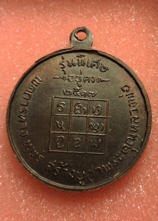 ด้านหลังเหรียญมียันต์ครู ตาราง 9 ช่องใต้คำว่า รุ่นพิเศษ / อยู่คง รอบเหรียญเขียนไว้ว่า แขวงการทางแพร่สร้างบูชาพระคุณหลวงพ่อ