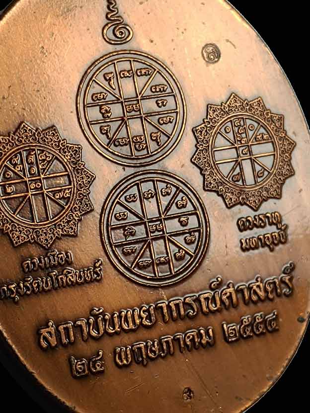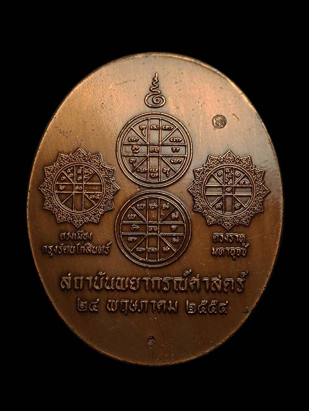 ด้านหลังเป็นยันต์ดวงเมือง - ยันต์ราหูมหาอุจจ์ การที่มียันต์ดวงเมืองกำกับ หมายความว่า ภายใต้บารมีของดวงเมืองแห่งนี้ ประเทศนี้ ดวงเมืองที่อยู่มาจนถึง ๒๒๙ ปีที่มีความศักดิ์สิทธิ์ ด้วยได้รับพระบารมีจากอดีตบุรพกษัตรา กษัตรี และพระสยามเทวาธิราช ร่วมประสิทธิ์ประสาทพรอยู่ในยันต์นี้ และยันต์ราหูมหาอุจจ์ ๒๔ พฤษภาคม เป็นวันประวัติศาสตร์ ที่มีคนไปร่วมพิธี ณ วัดพระศรีมหาธาตุ บางเขน มากเป็นประวัติการณ์ที่ทุกคนจะจำได้