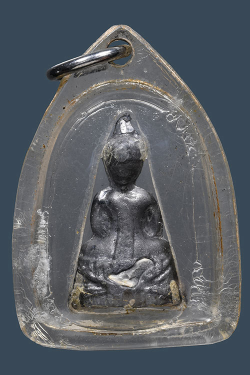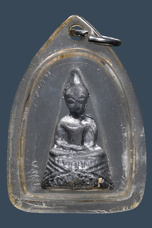 พระพุทธฝังเขี้ยวหมาป่า เนื้อชินตะกั่ว หลวงพ่อดำ วัดบางกุฎีทอง เลี่ยมพลาสติกพร้อมใช้