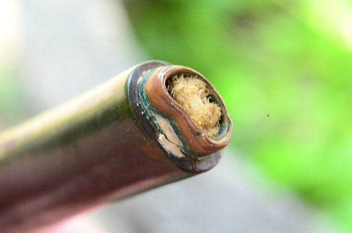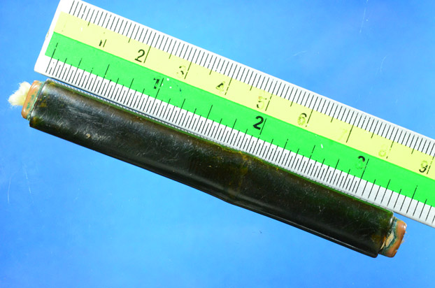 ตะกรุด เนื้อทองแดง เก่าไม่ทราบที่ครับ เจ้าของเดิมหุ้มหลอดยางไว้ครับ |