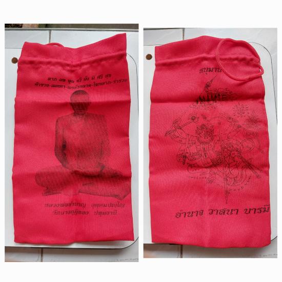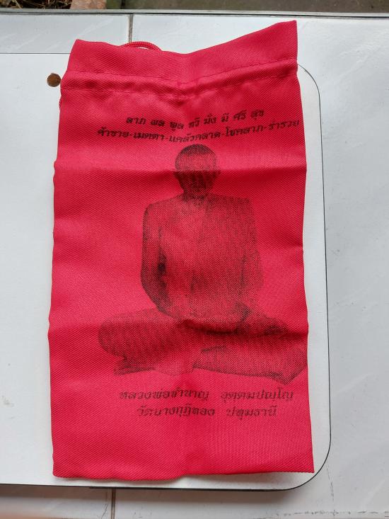 ถุงโภคทรัพย์ ขนาดกว้าง 5 นิ้วยาว 9 นิ้ว ด้านหน้าเป็นรูปหลวงพ่อชำนาญนั่งเต็มองค์ ส่วนด้านหลังเป็นหนุมานนำทัพชนะศึก สีแดง หลวงพ่อท่านปลุกเสกในพรรษา ให้เป็นโภคทรัพย์ เป็นของเก่าเก็บครับ ผมเก็บมาเองราวๆ 20 ปีแล้ว อยู่ในซองซิป ถุงรุ่นนี้จำพ.ศ ออกไม่ได้ แต่อยู่ที่ประมาณปีพ.ศ 2545-50 ครับ เอาไว้เก็บเงินทอง,เก็บโภคทรัพย์ต่างๆ หรือเก็บพระเครื่องของหลวงพ่อ ที่ห้อยประจำติดตัวครับ