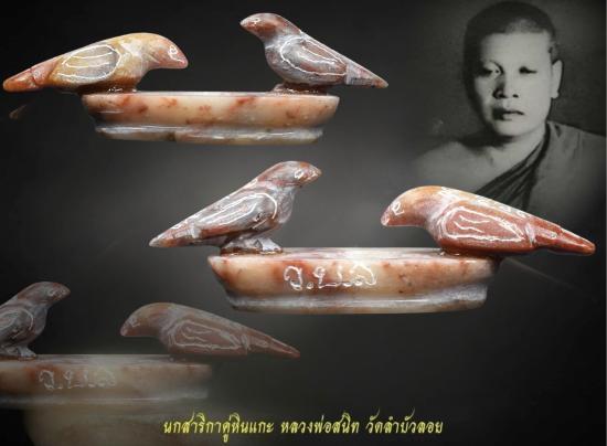 นกสาริกาคู่หินแกะ (เนื้อหินสบู่) หลวงพ่อสนิท วัดลำบัวลอย จ.นครนายก เก่าๆ สร้างน้อย หายากมาก เป็นยุคเดียวกันกับเต่าหิน อีกหนึ่งสุดยอดเมตตา มหานิยม ของหลวงพ่อสนิท สร้างจากวัสดุหินอ่อนหรือ หินสบู่ หลังปี 2509 - ปี 2538 ขนาดเล็ก บรรดาเครื่องรางที่หลวงพ่อสนิทท่ายจัดสร้าง ซึ่งมีทั้ง จระเข้ พญาเต่าเรือน นกสาริกา สะดือหนุมาน สีผึ้ง พระเครื่อง ตะกรุด ผ้ายันต์ ฯลฯ ต่างมีอภินิหาร เป็นที่ประจักษ์มากมาย มีประสบการณ์เล่าสู่กันมาจนทุกวันนี้ หลวงพ่อสนิทท่านจะะสร้างอย่างพิถีพิถัน ตามตำนานโบราณ ปลุกเสกจยกระทั่งมีชีวิตจริงจึงถือว่าเสร็จพิธี ด้วยพลังจิตอันเข้ม ทำให้เกิดอัศจรรย์แก่ผู้ศรัทธาญาติโยมที่นำไปบูชาเป็นอันมาก เช่นการทำมาค้าขายมีสภาพคล่อง มีลูกค้าและยอดขายเพิ่มมากขึ้นอย่างเห็นได้ชัด และเป็นเมตตามหานิยมขั้นสูงอีกด้วย