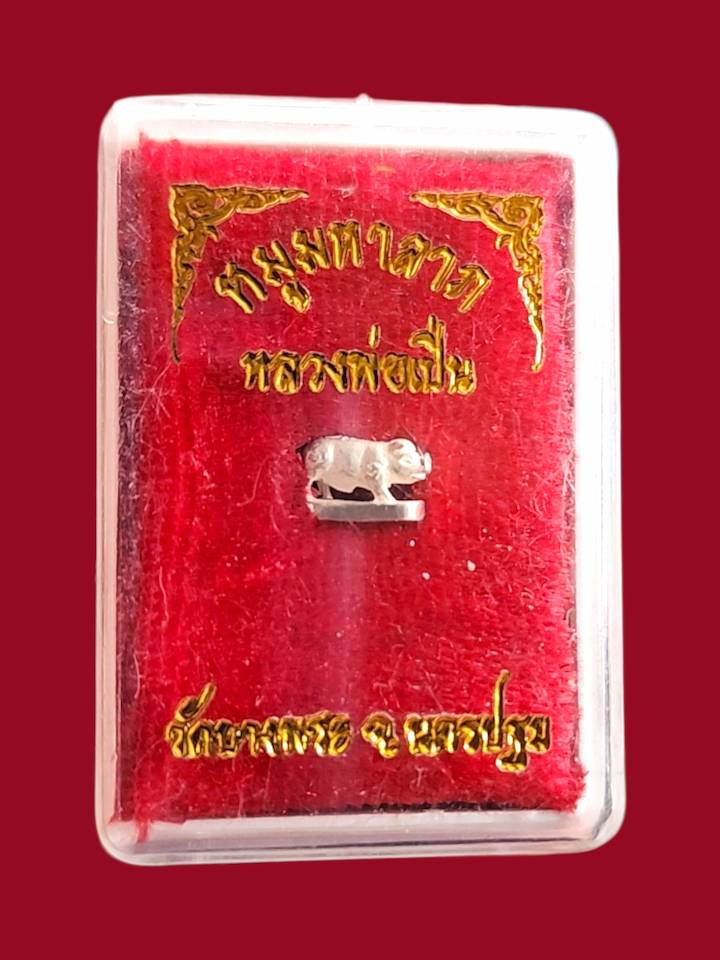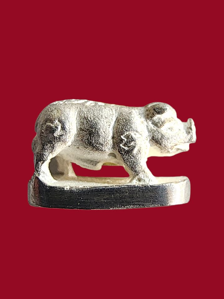 ลักษณะและเนื้อวัตถุมงคล: เป็นหมูขนาดเล็กจิ๋ว เนื้อเงินแท้ และมักจะพบเห็นในสภาพสวยเดิม องค์จริงจะมีลักษณะอ้วนกว่าของเลียนแบบในตลาด |